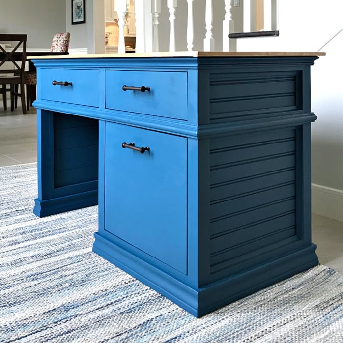 I built 2 versions of this desk for my 2 kids. The red version has light blue drawers, flat panels and a 3/4" Birch plywood top. The blue version has tan drawers, beadboard panels and a 1/2" Maple plywood top. Customize the panels, top, and colors to design your own desk.