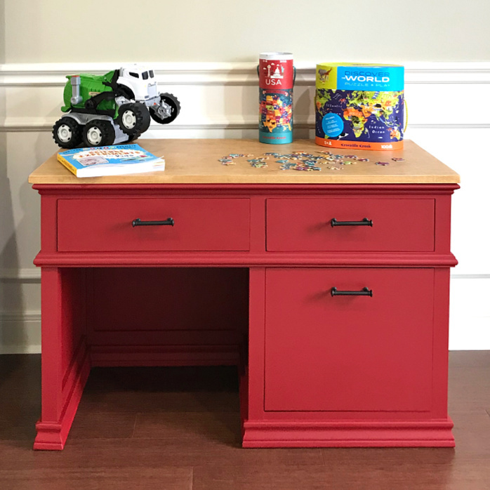 I love this little DIY kids desk and so do my boys. They fill those drawers with art projects, school work, and all the little treasures they want to keep. If you're homeschooling, this desk has plenty of room for schoolwork and books. And that desktop is a large space for getting work done.