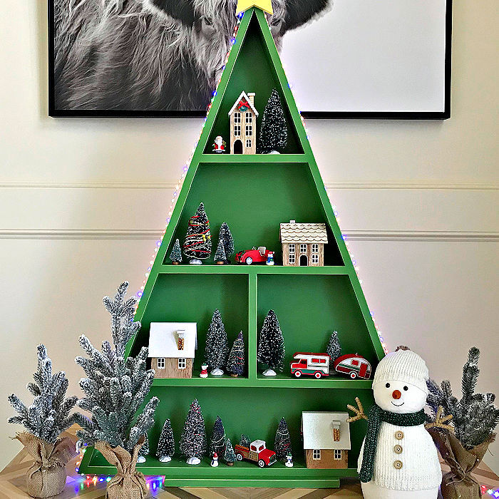 This Christmas Tree Display Shelf can be used so many ways. Use it to display your favorite ornaments or Christmas decorations. Use it as a Christmas Cookie and Cocoa Bar. Or, use it as a fun mini Christmas Village or Train Set display.